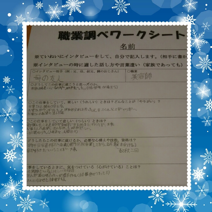 先日、友達の娘ちゃん(6年生)の冬休みの宿題、職業インタビューを受けてまいりました~♪