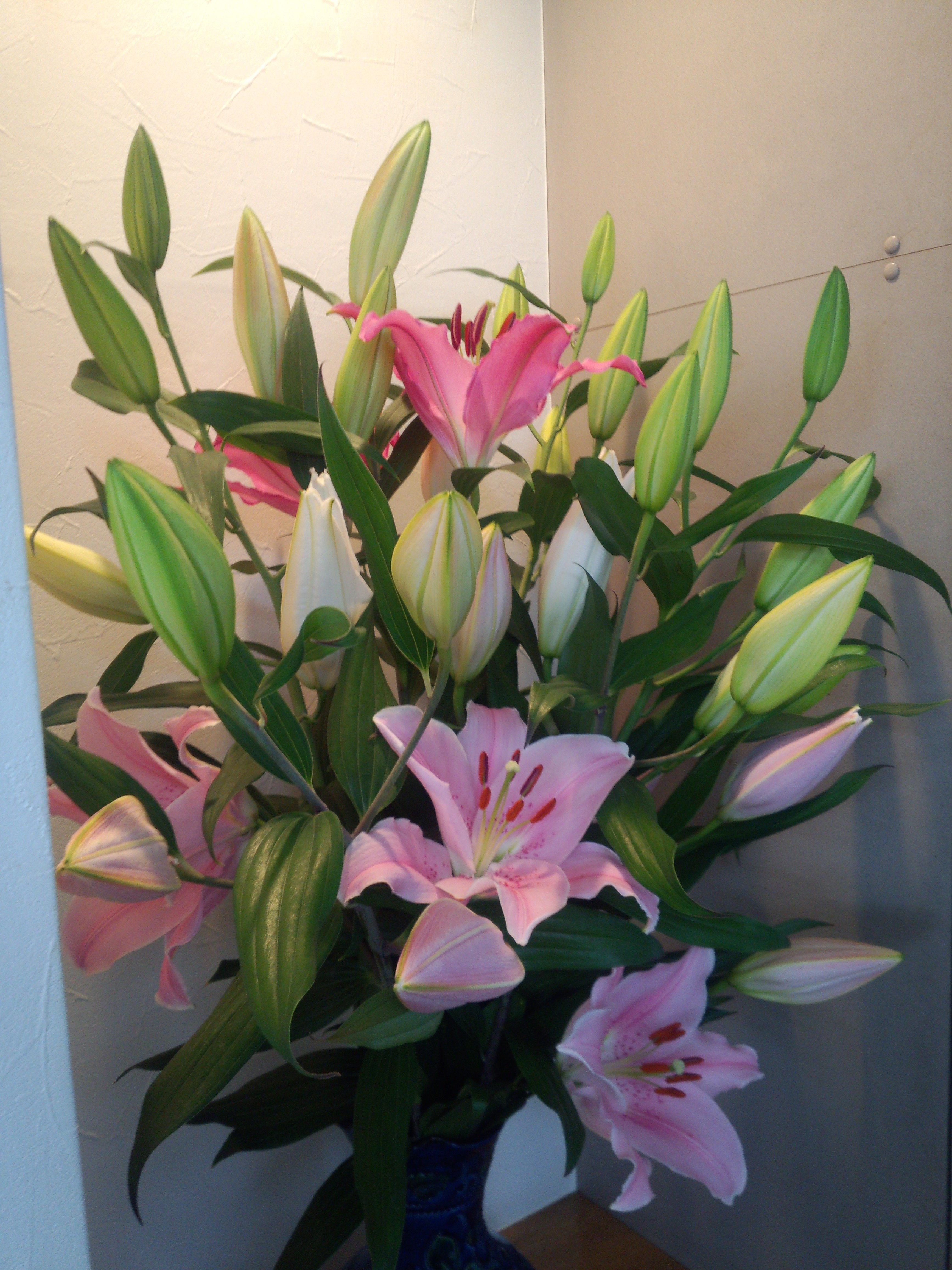 この見事なゆりっっ!!!お花があるとお店が明るくなりますね。お客様が入ってらして「わ~きれい~っ」って言ってくれるとすごく嬉しくなります。ですが、このゆり・・・全部咲くときれいって言うかこわい(笑)