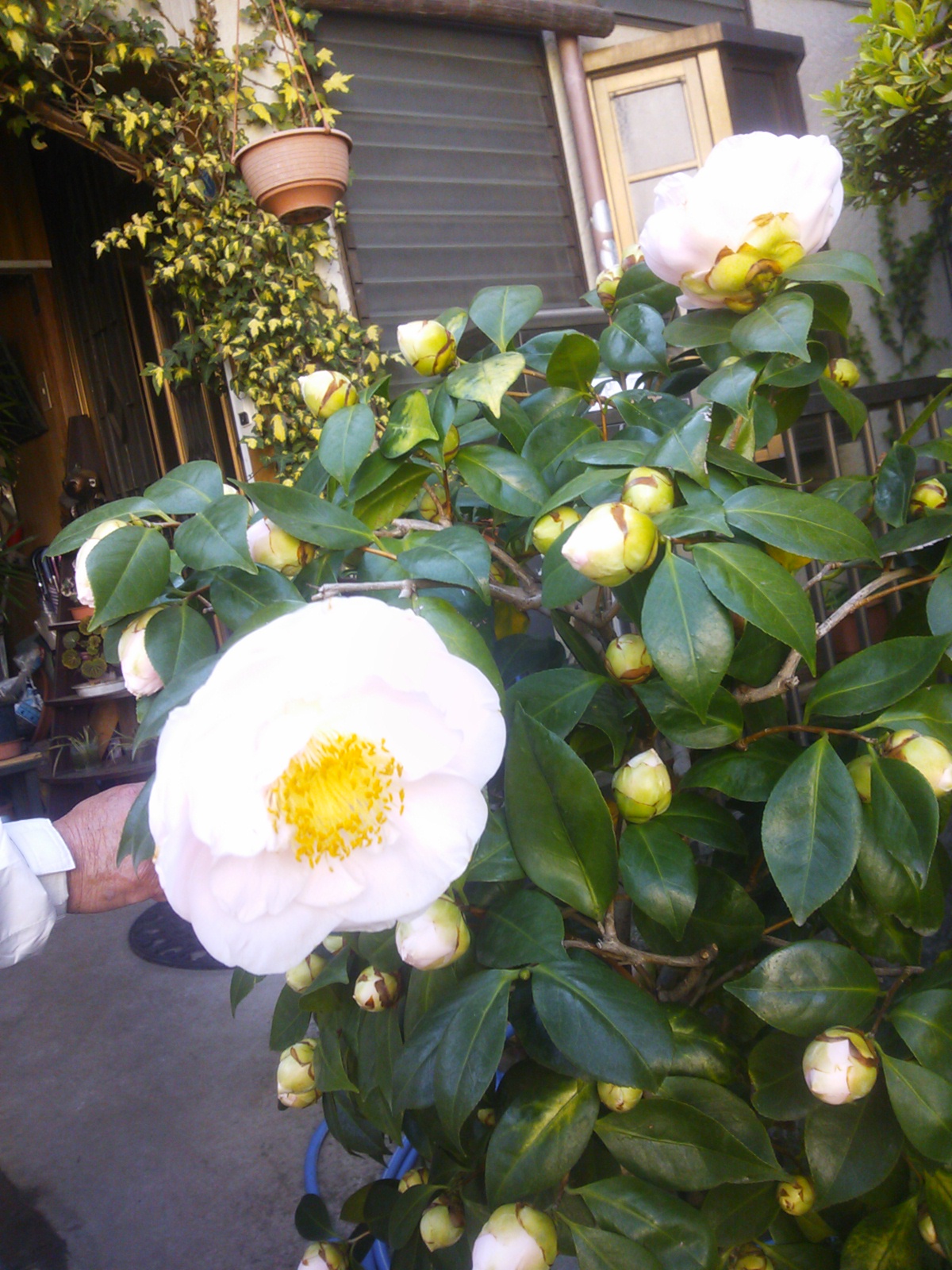 今朝ご近所さまの椿が咲き始め、お写真撮らせていただきました♪お花の鉢がいっぱいでひそかに私も楽しませていただいてます(^-^)