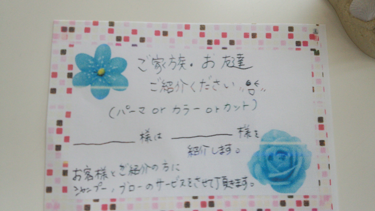 お友達、ご家族ご紹介くださませ。大事なお客様がご紹介してくれたその方に喜んでいただけるようにがんばります。そして、お客様と、その方にエミ美容室自慢の癒しのシャンプーをサービスさせていただきます。