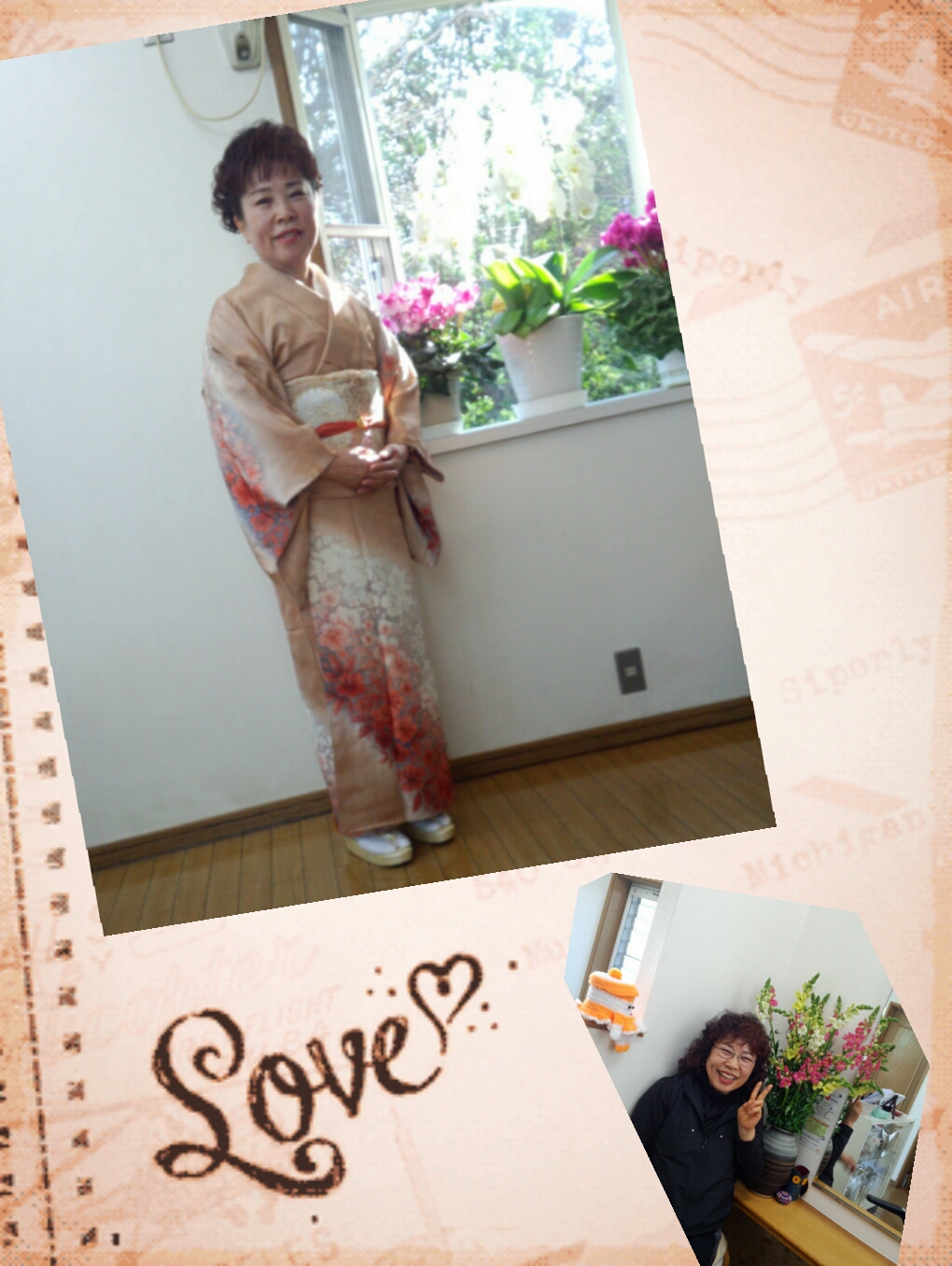 新年会でおでかけの先生。珍しく華やかなお色の着物♪いつも地味なお色が多いからこのお着物気にいった!