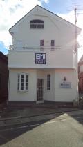 白い建物に出窓、青いロゴ。もうオープンがすぐそこです。