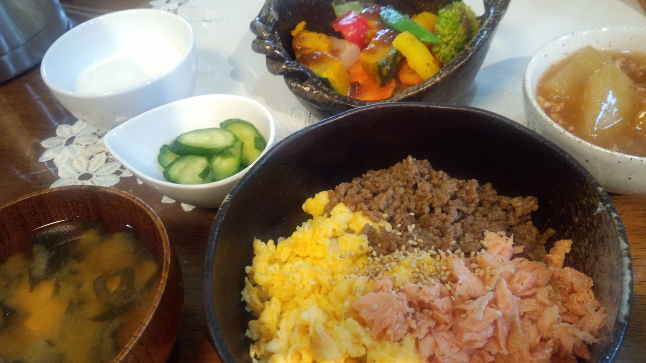 今日は「三食丼」!お客様にいただいた冬瓜もありますっ(≧∇≦*)