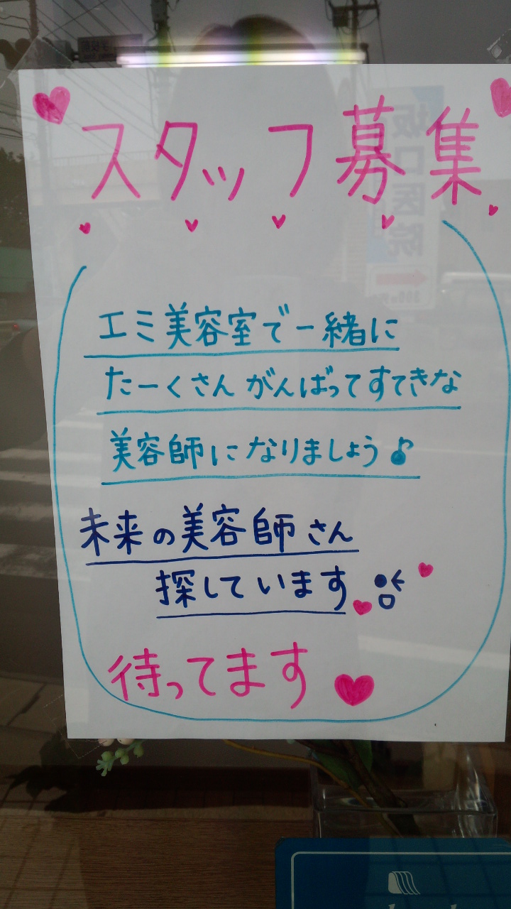 どこかに美容師になりたいお嬢さんいませんか?資格はなくてもいいんですよ~。通信で資格は取ることができるのでしっかりサポートもしますし、確実に技術力もつくと思います。