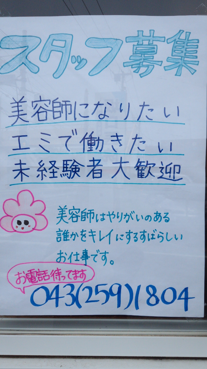 エミ美容室ではスタッフを募集しています。なんでかって?じゃあ言っちゃおっかな~。なんとっ!エミ美容室2号店ができるんですっっ!