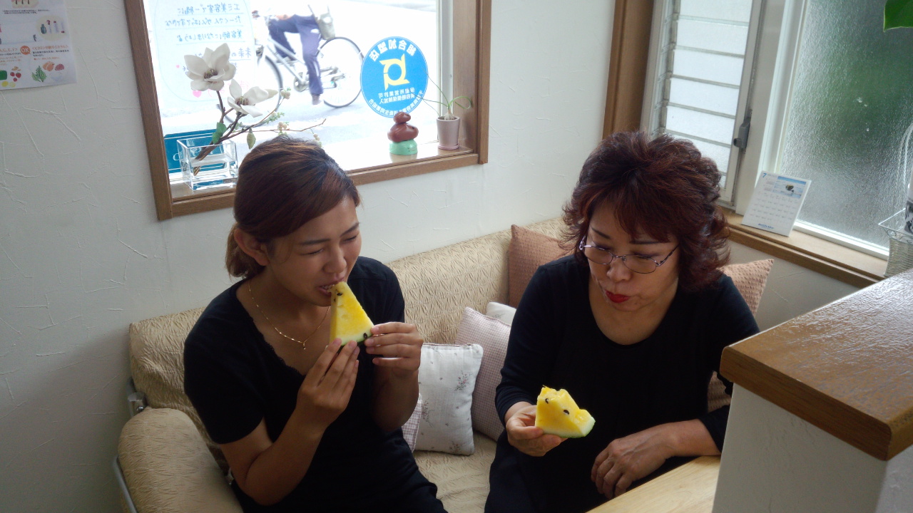 そのスイカをおいしそうに食べている2人・・・ん?誰?美千代さんじゃない!!!
