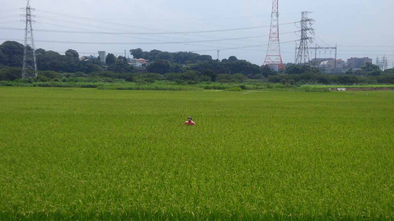 畑や田んぼもいっぱいあって、農家のお客様からいただくお野菜はどれも新鮮でメッチャおいしい。その田んぼには鳥よけなのか人みたいな人形があちこちにいておもしろいです。戦隊もののヒーローみたいです。思わず立ち止まって写真撮ってきました。