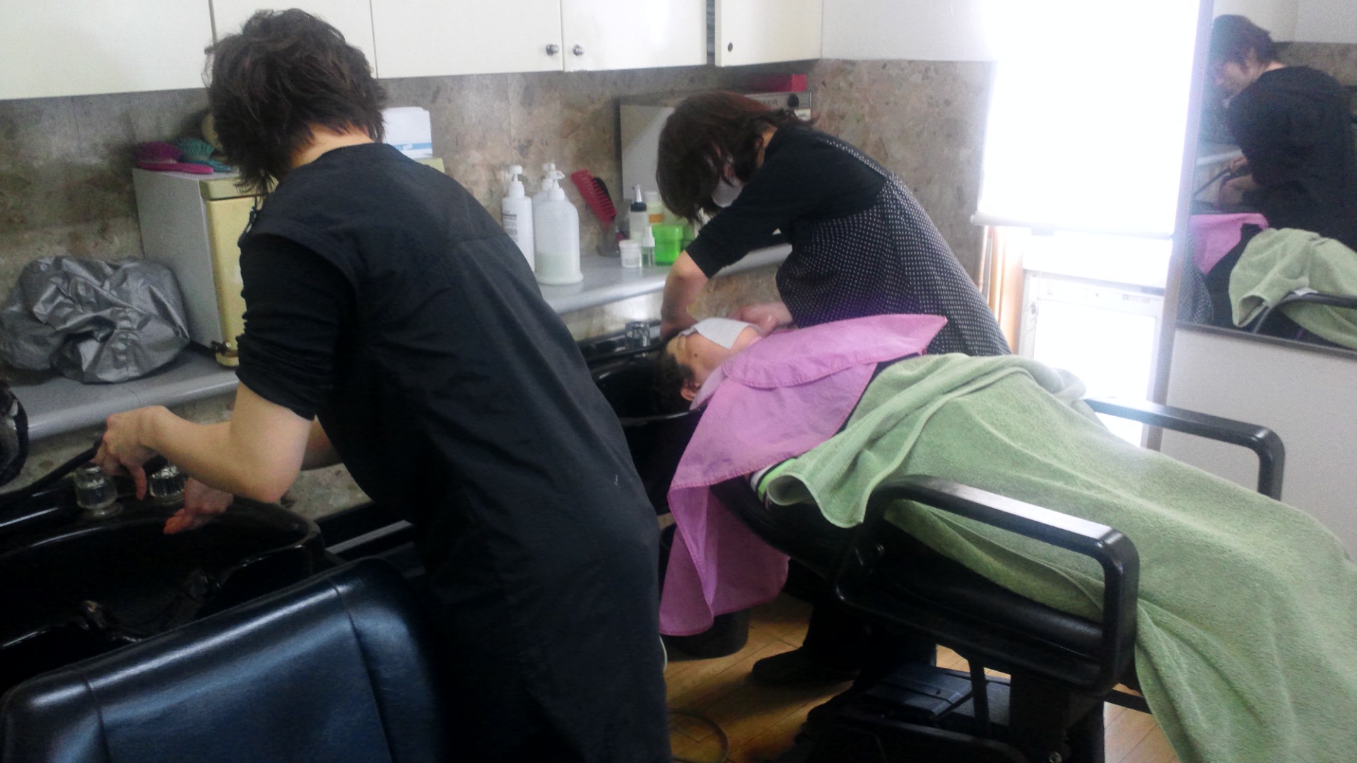 初のシャンプーに挑戦しています。指導にあったてるのはエミの番頭さん、美千代さんです!