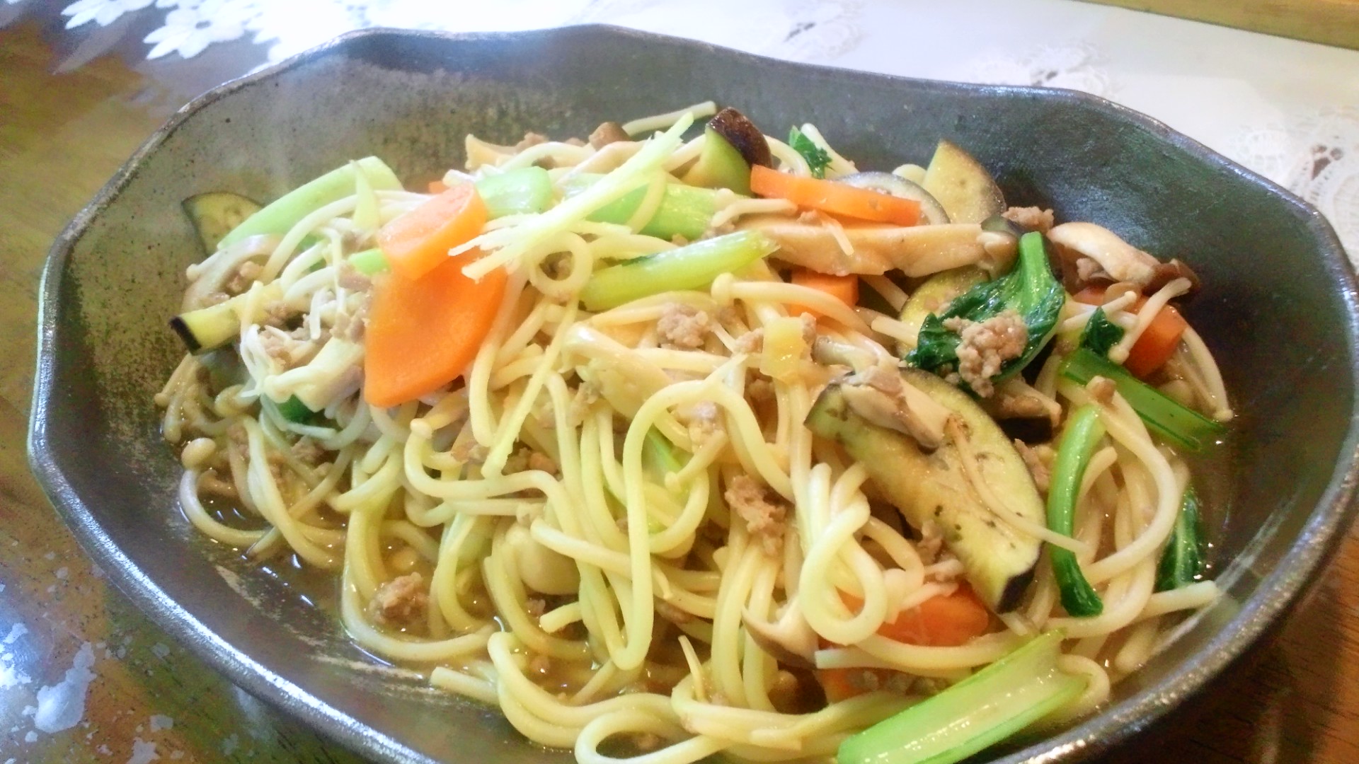 今日のランチは「けやき風パスタ」!本日初の登場です。いつも食器を購入する益子で立ち寄るレストランのメニューを再現です♪ショウガがきいてておいしいです。パパさんごちそうさまでした。 |