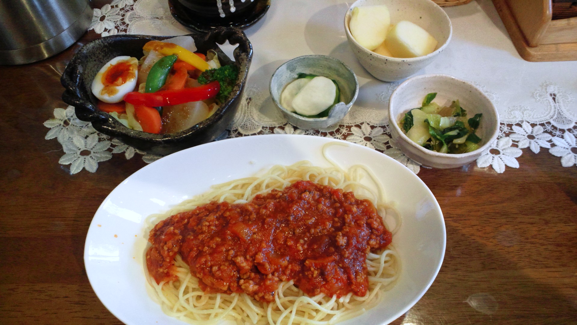 今年一回目のランチは「ミートソース」(●^o^●)このメニュー、ファンが多いです。寒くなってきてからはサラダが温野菜になっていて女性には嬉しいパパさんの優しさあふれる配慮。