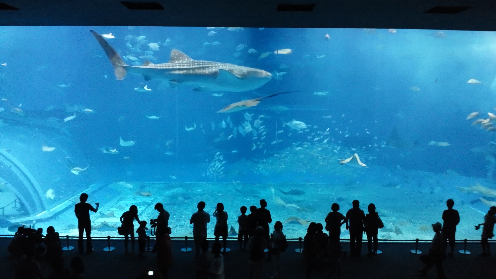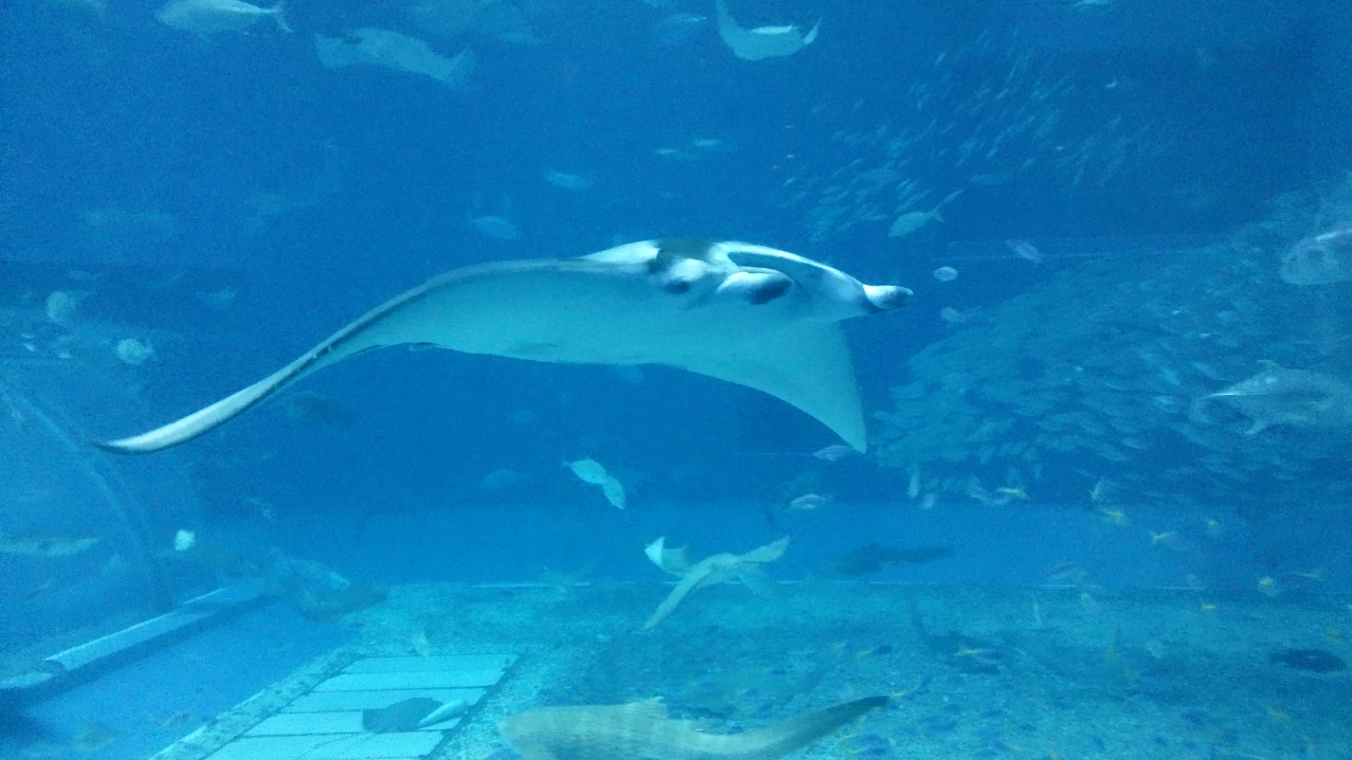 これは美ら海水族館の「マンタ」です。大きな水槽で気持ち良さそうにおよいでいましたよ~。可愛い顔してるの。癒されますね、水族館は。 |