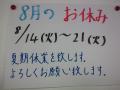 8月の14日(火)~21日(火)までお休みさせていただきます。