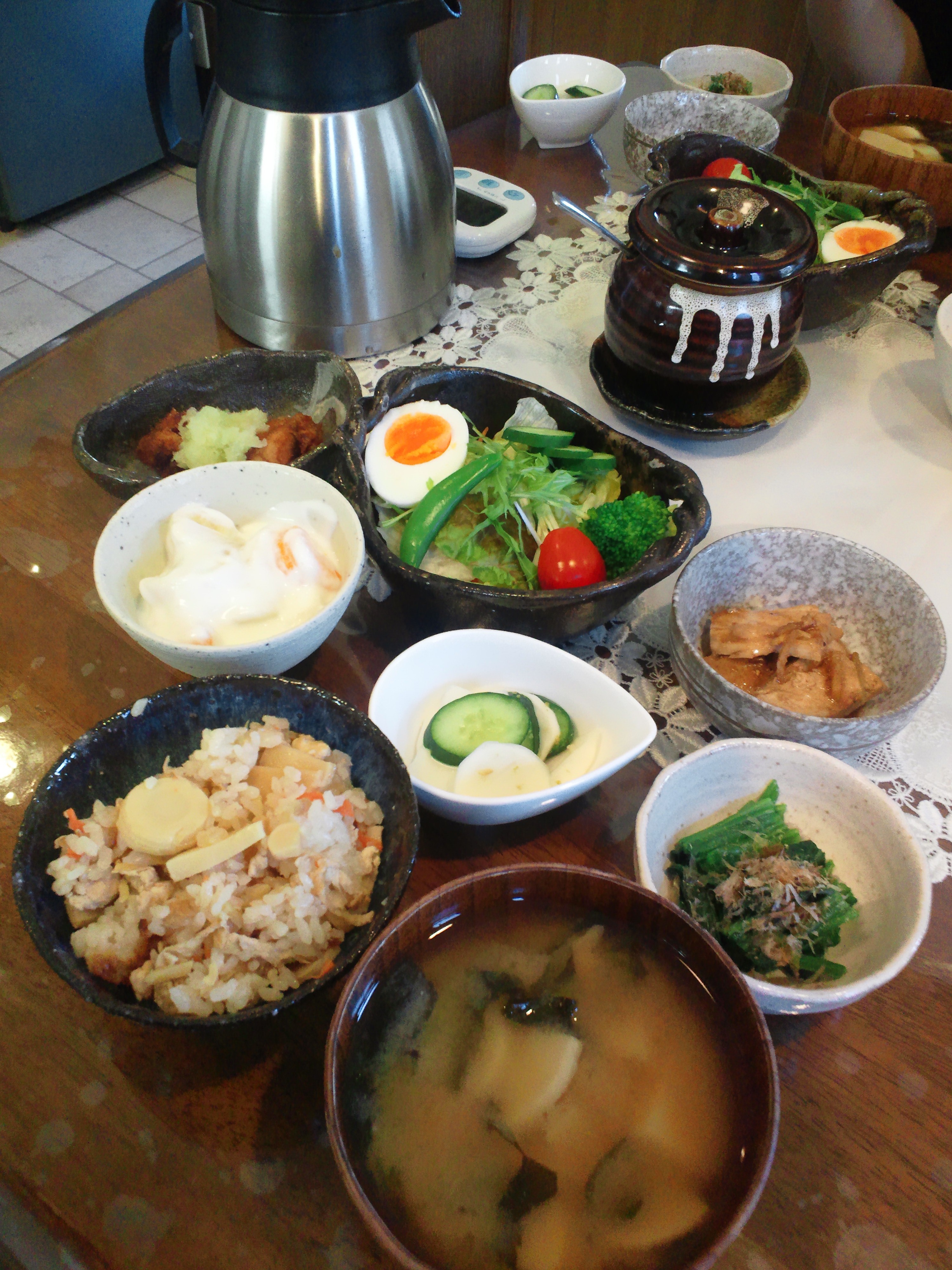 今日のランチは初物「筍ご飯」でした♪昨日のお休みに先生が掘ってきた筍さん。筍ご飯にお味噌汁、もうそんな時期って感じです。