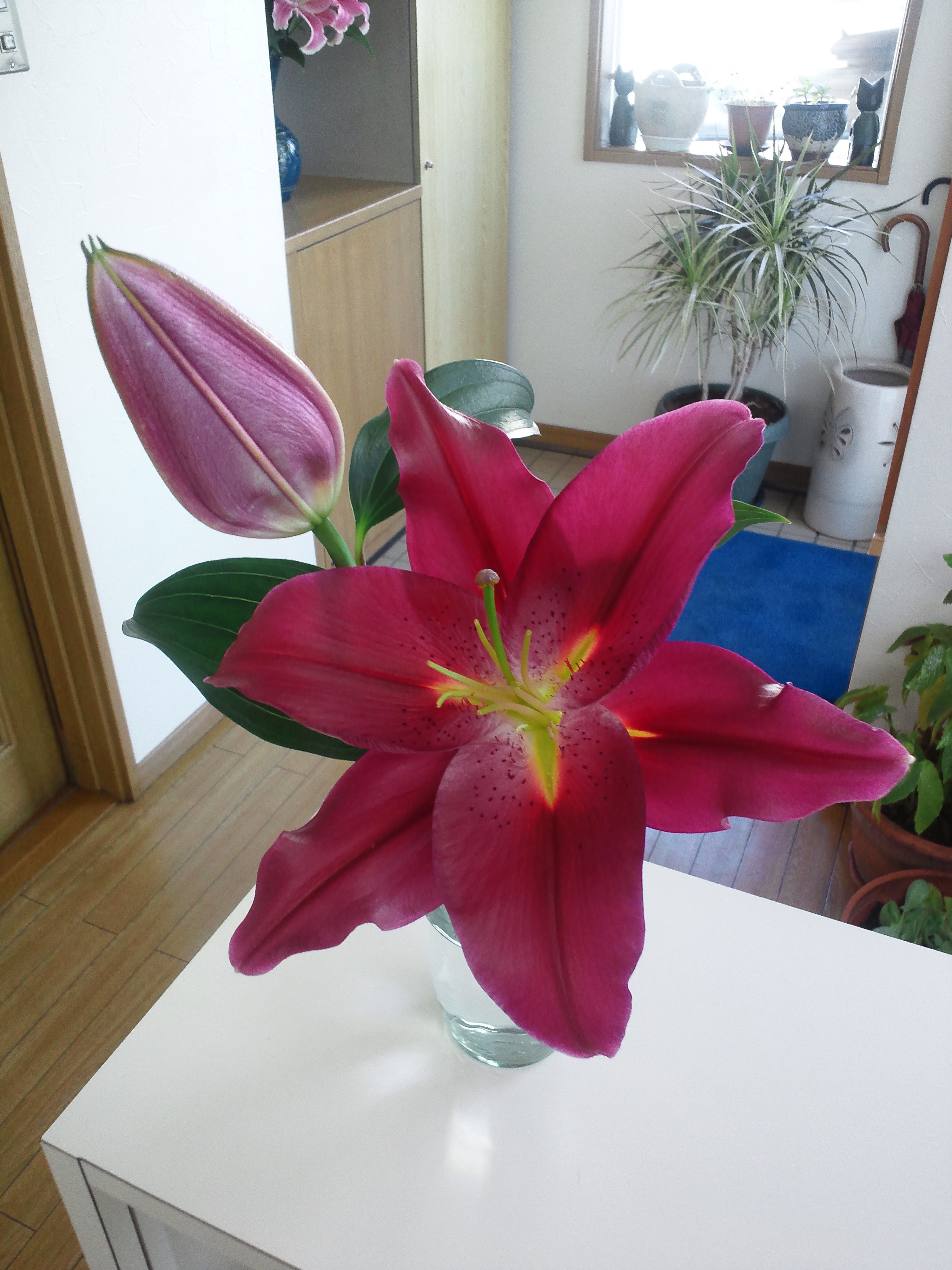 先日アップした「人食い百合」ついに花が咲きました!私たちがそう呼びたくなるくらいに大輪で近くを通るのが怖い・・・。