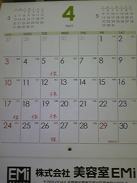 4月の定休日です。
