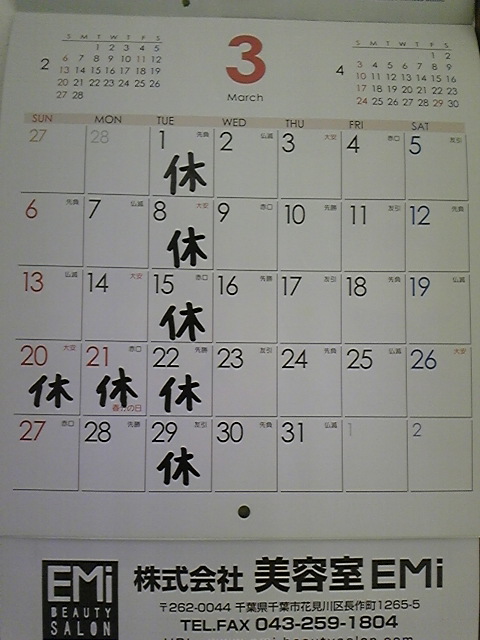 3月の定休日です。