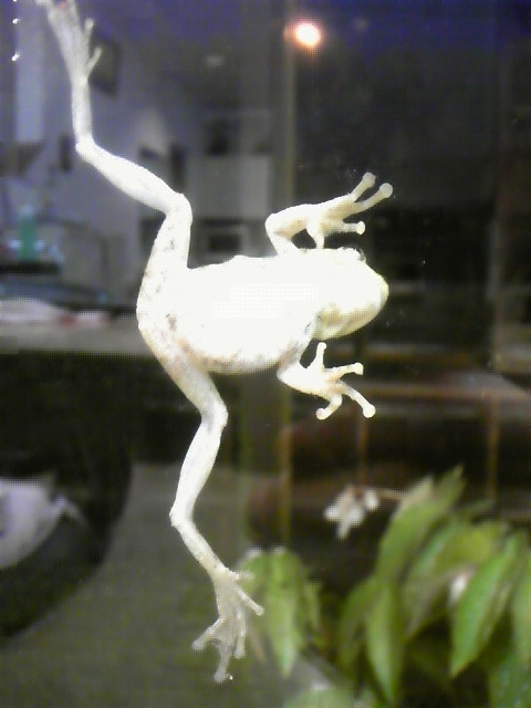 ピョン吉です。窓にへばりついていたので写真とってみました。きっと白い建物に寄ってくる小さな虫をねらっているのでしょう。