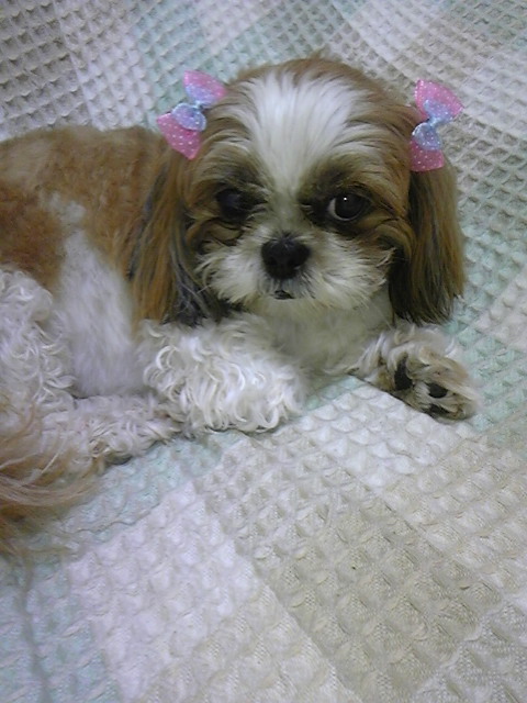 って事でうちの犬に可愛いリボンつけちゃいました♪ |