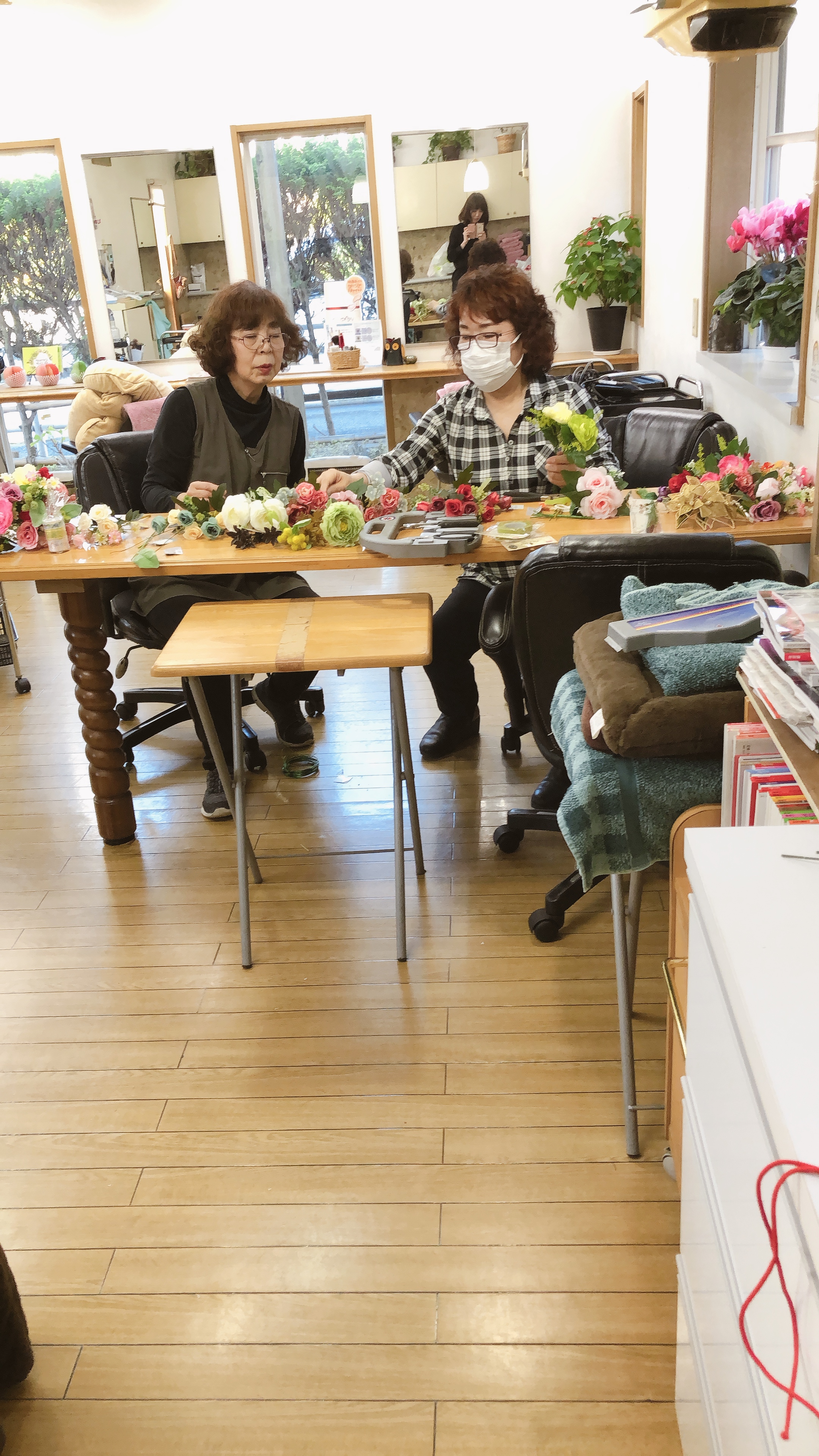 成人式のお嬢様達にプレゼントする帯飾り制作中の先生と市東さん