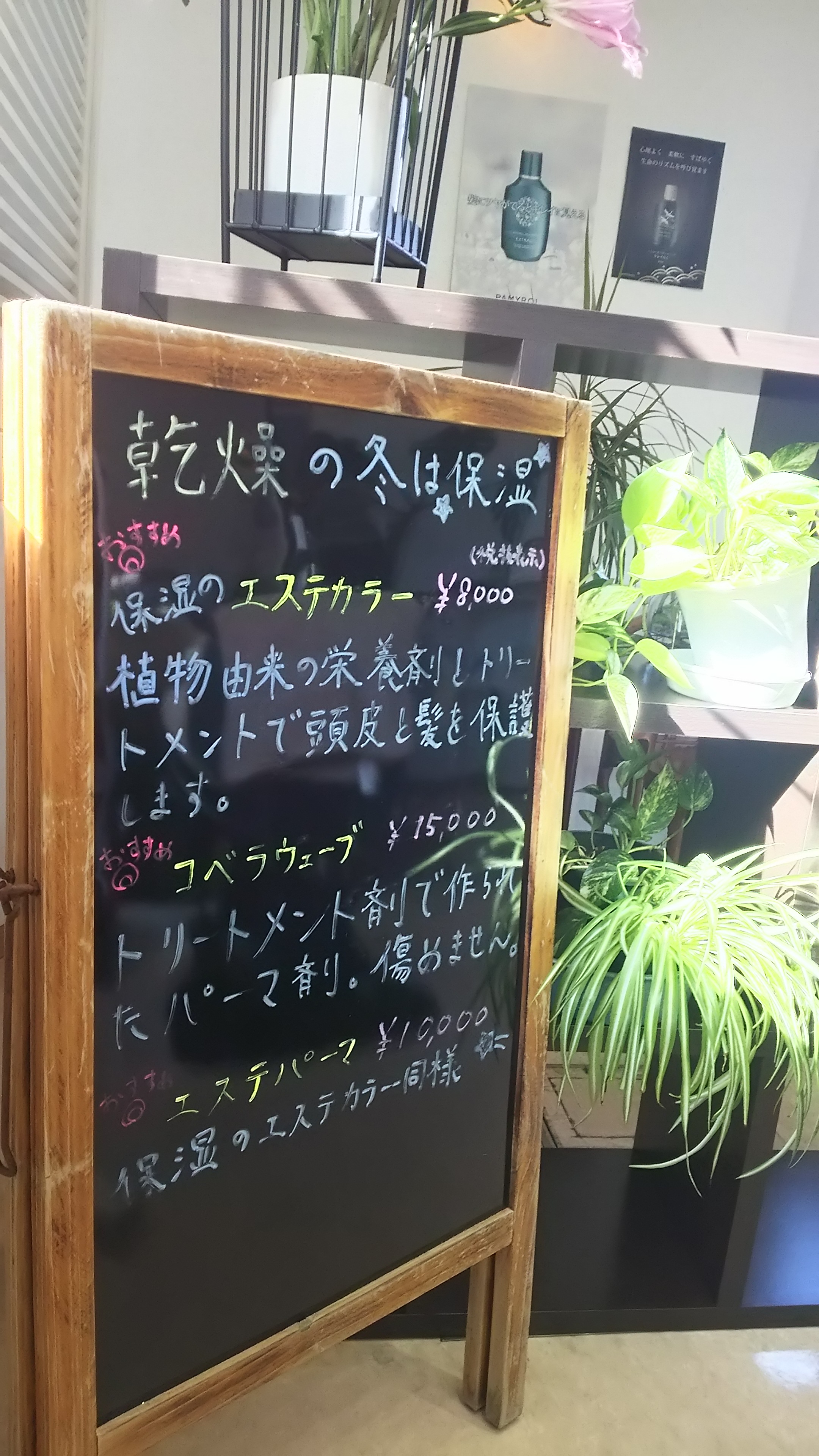 久しぶりに今朝は晴れ♪雨に濡れた黒板を書き直しました。冬は保湿が大事です☆ |