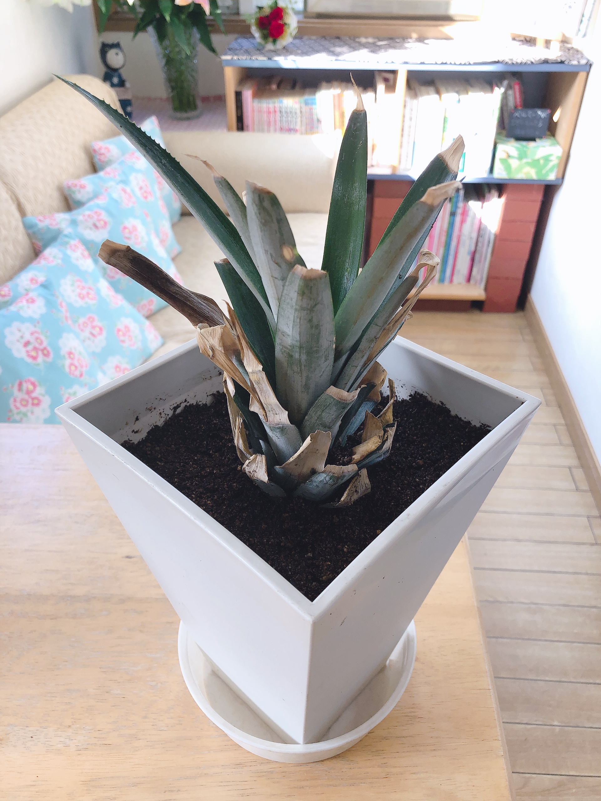 話しは変わり、今日、パイナップル先輩(ジョージがうまく育たなくて2代目)を土に植えかえたんです!ジョージに比べるとパイナップル先輩への想いはかなり薄いのですが 根が伸びてたのでがんばりました!
