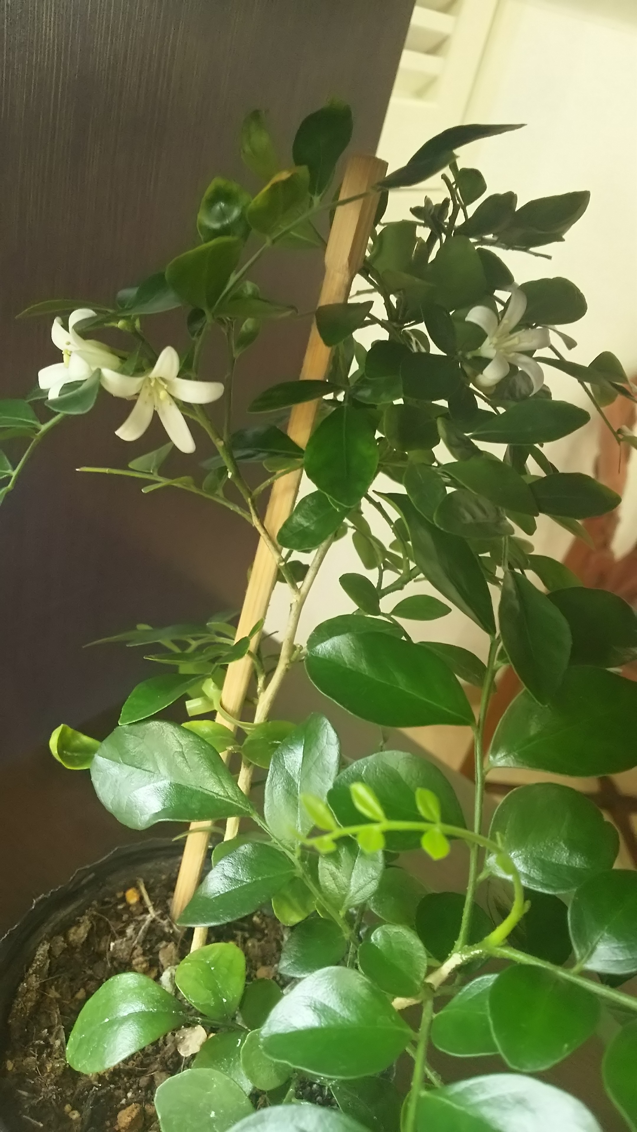 ゲッキツという観葉植物を100均で買い育てていましたが、今朝咲いてました♪