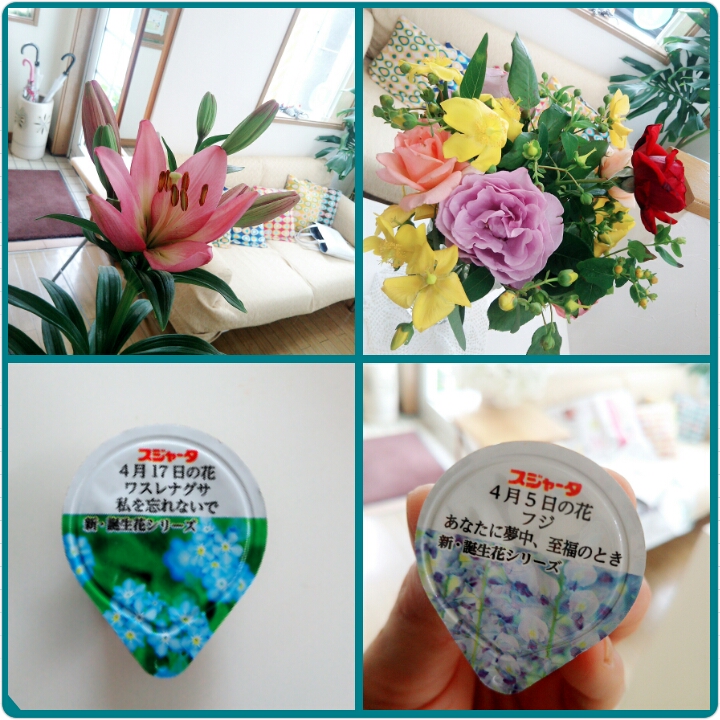 今日は先生が育てたユリと紫のバラも仲間入り♪そして、コーヒークリームの花言葉でお互いの気持ち確認(笑)
