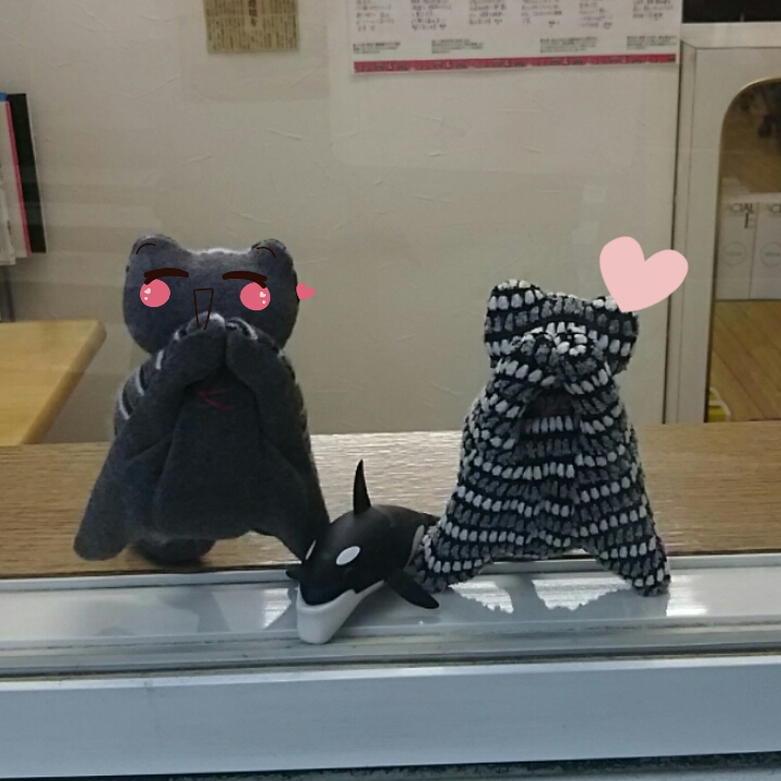 閉店後お掃除してたら、待ち合いの窓に飾ってあるネコが変化していました。
